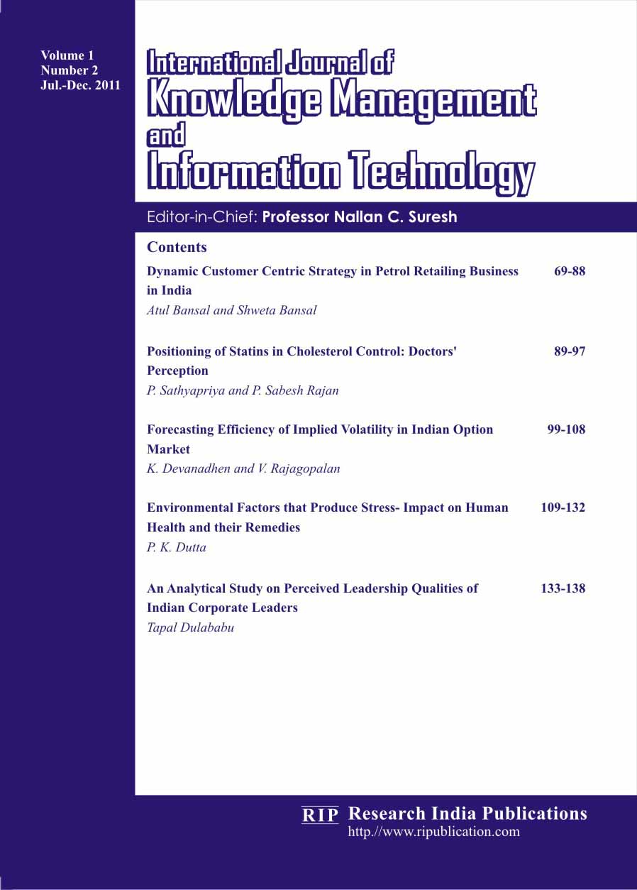 Aims and Scope : The International Journal of Knowledge Management and Information Technology (IJKMIT) is a refereed journal in the field of information technology (IT) and knowledge management (KM), providing an international forum for professionals, engineers, researchers and managerial decision makers. It covers technological, managerial, political, economic and organizational aspects of the application of IT. The IJKMIT aims to provide a forum for professionals and academics in the field to exchange ideas and disseminate knowledge across the full range of issues within the field of information technology. IJKMIT reports the new paradigms in emerging fields of technology, management and envision the future developments in the frontier areas. The journal covers wide range of topics but are not limited to the following: Knowledge creation, acquisition, codification, classification, organization, sharing, transfer, application, protection and retention Management and implementation of knowledge management, Measurement of knowledge management performance and benefits, Techniques and methods for managing knowledge, Human, organizational, strategic, behavioral, and socio-cultural aspects of knowledge management, Design and development of knowledge management, Knowledge management and ethics, Managing the rapid changes in information technology (IT), Emerging advances in IT and its new applications, Knowledge economy, Enterprise resource models, Organizational barriers to implementing IT, Intelligent organizations, Social informatics, Intellectual property rights in IT. Publication Date and Frequency: Two issues per year. Submission: Authors are requested to submit their papers electronically to submit@ripublication.com with mention journal title (IJKMIT) in subject line. Annual Subscription Price: (Outside India) Library/ Institutional: Print : US$320.00 Online Only: US$300.00 Print + Online : US$:360.00 Individual/ Personnel: Print US$160.00 Inside India: Rs.3500.00